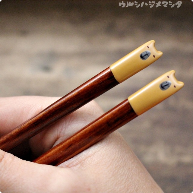 ※※ 完 売 し ま し た ※※ ※※ ありがとうございました ※※ ※※ SOLD OUT. THANK YOU ※※ 2018年限定 ========== 拭き漆のお箸(カピバラ) 拭き漆(※1)の技法で作ったアニマル箸です。国産のヒバ(アスナロ)材の箸木地を手で1本ずつ動物の形に削り、手で塗り、手で研ぎ、約2か月かけて作っています。 ウルシハジメマシタの箸は7回塗り重ね、その間に2回研いでいます。 塗り重ねた艶は落ちにくいと言われ、長くお使いいただけます。また木地が十分水分(漆)を吸っているため、食べ物の汁や洗い物の水を吸いにくく、衛生的です。 劣化が早い先端に黒漆を塗って、劣化を遅らせる工夫をしています。 【産地】 箸(ヒバ(アスナロ)/日本) / 漆(中国) 【サイズ】 長さ約23cm/重さ約8g 【注意】 ※天然木・手作りのため、色、サイズ、形などに多少のバラつきがあります。 ※写真は一例です。 ※子供サイズ(約18cm)もあります。 【備考】 ※1 拭き漆 木地に漆を薄く塗ってから拭き取るという工程を数回繰り返し、水分の吸い込みを止め、つやを上げていく技法。この工程の途中で、2~3回サンドペーパーで研ぎの工程を入れ、手触りや口当たりよく仕上げています。木目の美しさが際立ちます。 /////////////////////////////////// CHOPSTICKS with FUKI URUSHI (CAPYBARA) Animal chopsticks made with FUKI URUSHI technique (*1). I cut chopsticks of domestic Hiba (Thujopsis dolabrata) wood by hand one by one into animal shape, applied URUSHI (lacquer) by hand, and sharpened by hand. It takes almost 2 months. Chopsticks of Urushi.hajimemashita are applied URUSHI (lacquer) for seven times, and they are sharpened twice during that time. It is said that gloss applied URUSHI (lacquer) repeatedly is hard to deteriorate, so that you can use it for a few years. Moreover, since the wood is sucking enough moisture (URUSHI (lacquer)), it is hygienic because it hardly sucks soup and soapy water from washing dishes. I applied black URUSHI (lacquer) at the tip to delay deterioration. [Place of production] Chopsticks(Thujopsis dolabrata / Japan) / URUSHI(China) [Size] length: about 23cm / weight: about 8g [Remark] * Color, size and shape of each piece are different because it was made of natural wood by hand. * Photos are just examples. * I have shorter ones for kids(about 18cm). * what is FUKI URUSHI ... Apply URUSHI to woods and wipe it off. Repeat it for several times to privend woods from absorbing water and bring out the lustre.During this process whet the woods with sandpaper for 2-3 times to make them softer when you put it in a mouth and touch it.This technique makes the grain of woods looks more beautiful.